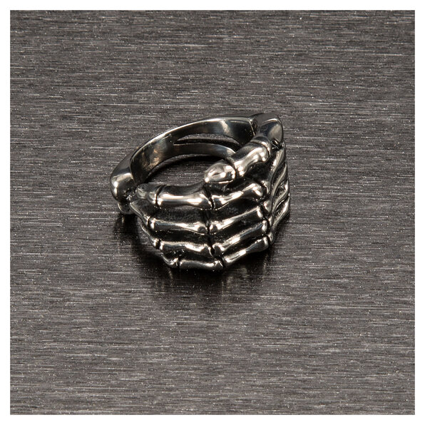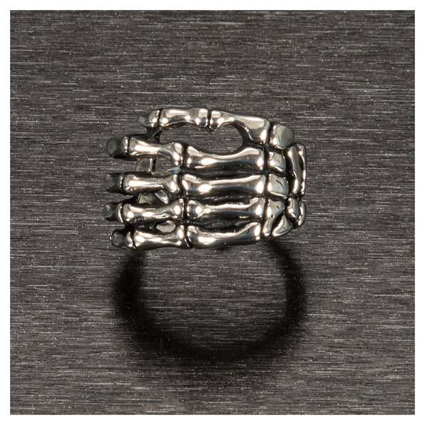 En acier brillant, finition filigrane, pas de bords coupants, une sensation agréable au toucher et un poids confortable. Nous vous présentons ici la bague *Dead Hand*. Comment lui résister ?