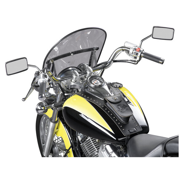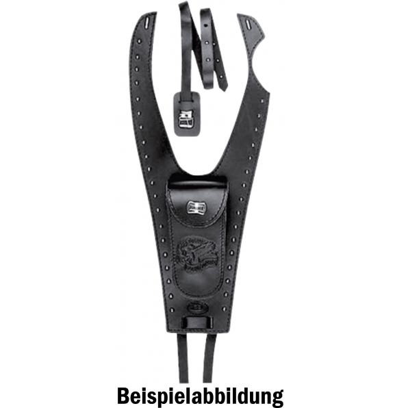 Protection du réservoir en cuir de vachette de 4 mm d'épaisseur, rivets décoratifs inoxydables, logo Eagle en relief et sacoche universelle sur certains modèles (exceptions, voir astérisques). Pour une meilleure adhérence, le dessous est revêtu d'un tissu antidérapant, qui protège la précieuse peinture du réservoir. La fixation s'effectue à l'aide de lanières en cuir (fournies à la livraison) sur la colonne de direction et sur le cadre de la moto, au-dessous de la selle.